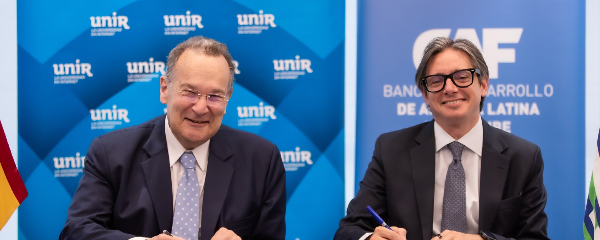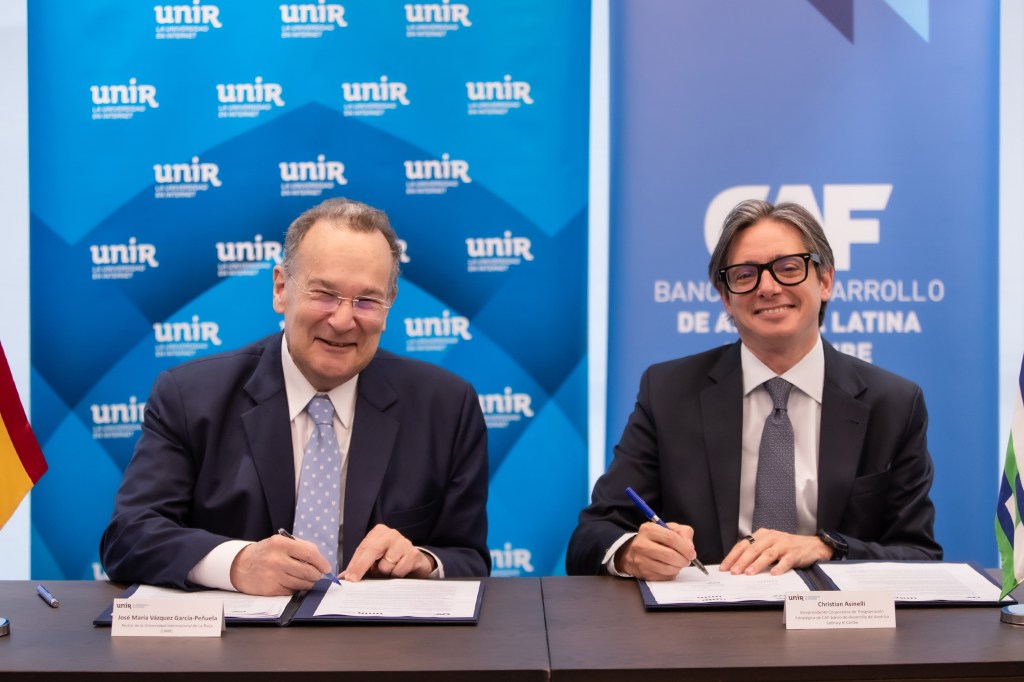 La alianza interinstitucional se formalizó en la sede de Proeduca en Madrid, grupo educativo al que pertenece UNIR. El acto de firma estuvo protagonizado por Christian Asinelli, Vicepresidente Corporativo de Programación Estratégica de CAF y José María Vázquez García-Peñuela, rector de UNIR, para quien el convenio supone “un paso importante en nuestro compromiso con la transformación educativa de Iberoamérica”.